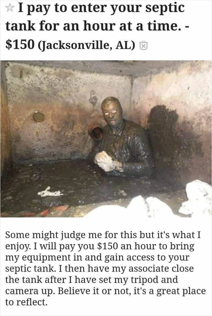 Some people might find this weird, but I like it there. I'm willing to pay $150 an hour for you to give me access to your septic tank. After I set up the tripod and camera, my assistant will seal the tank. Believe it or not, it's a great place to think.