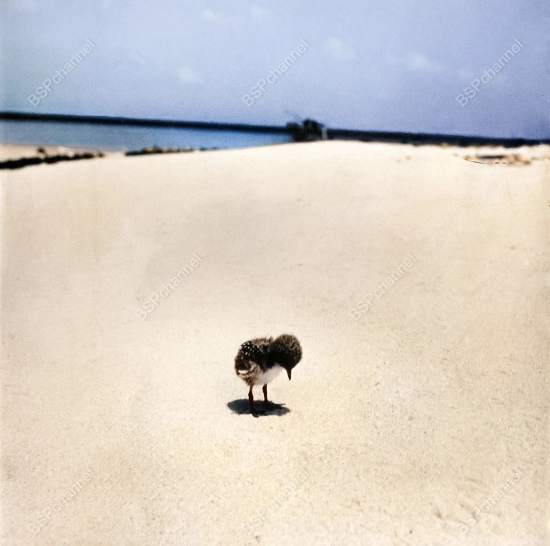 A sooty tern chick stands alone on the beach, waiting for its parents to return from their daily hunt at sea, 1954.