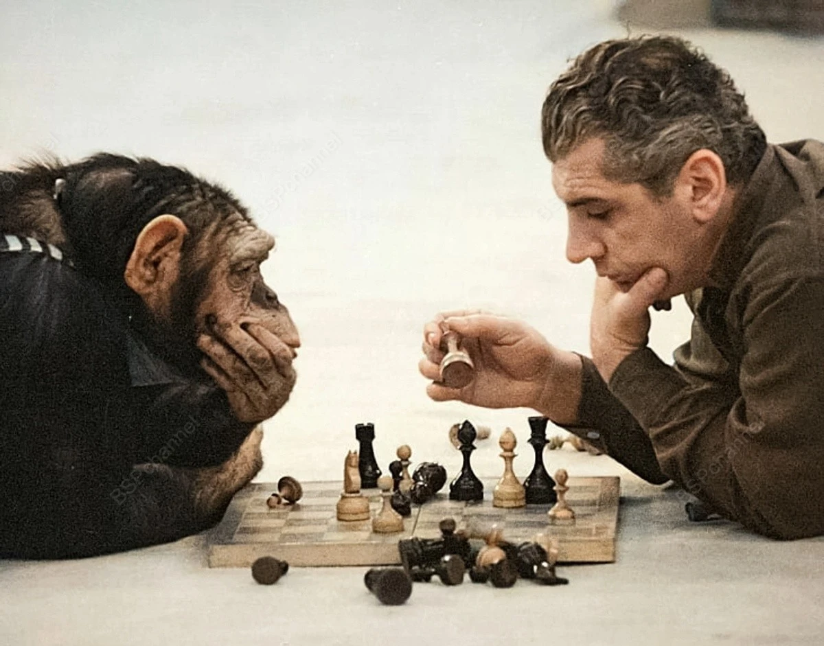 Rikki the monkey and his trainer, Stepan Isahakyan, playing chess. Yerevan, 1965.