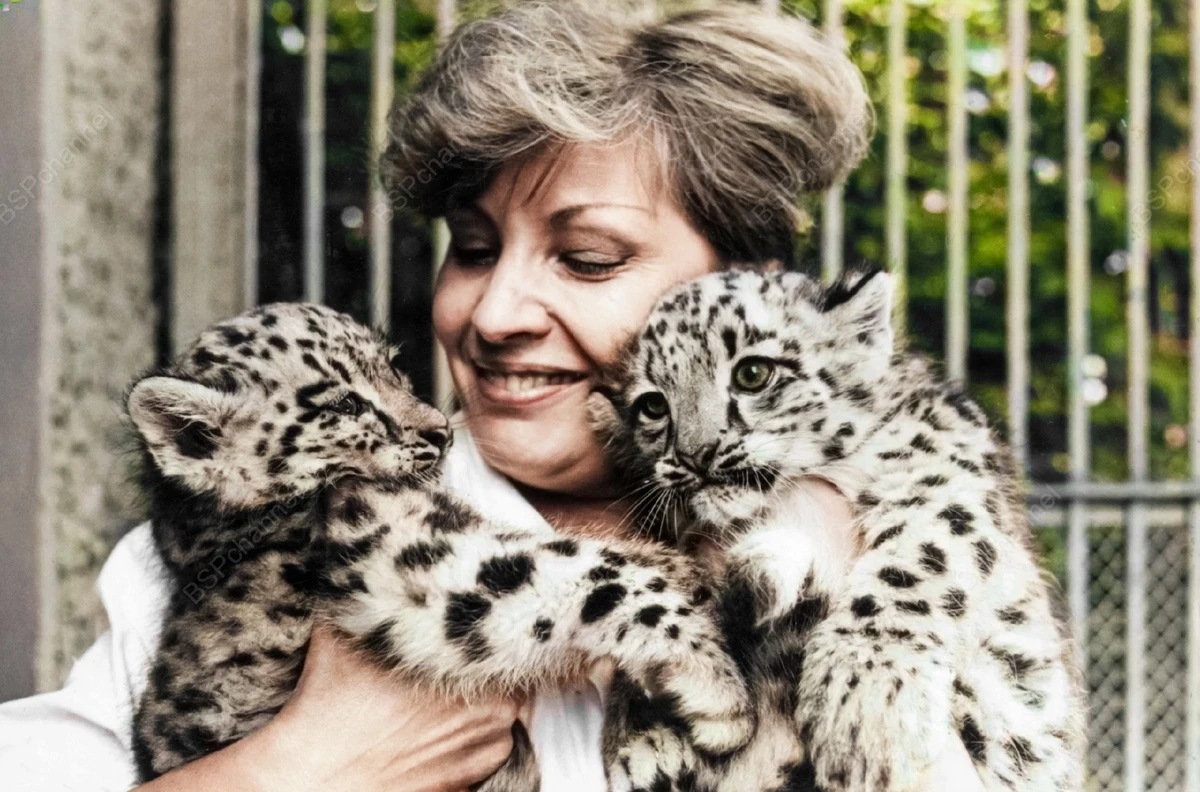 Moscow Zoo employee I.A. Kuzminykh with snow leopard cubs. Moscow, 1985.