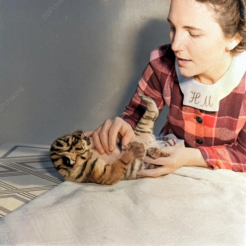 Helen Martini, the wife of the lion keeper at the Bronx Zoo, cares for three tiger cubs after their mother refused to feed them, 1944.