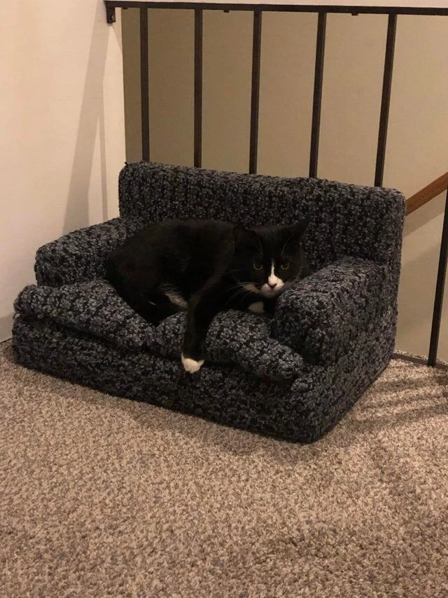 My girlfriend's mom knitted a sofa for our cat.
