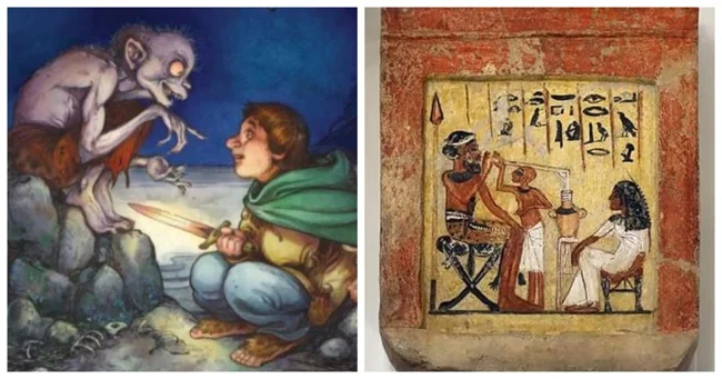 In the original 1937 version of "The Hobbit," Gollum was a much more courteous creature. After solving the riddles, he humbly showed Bilbo the way out, even after the Ring was lost. Since his nature was not revealed, the illustrators gave free rein to their imaginations, depicting everything from a ghost to a colossal monster.