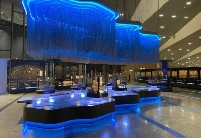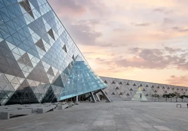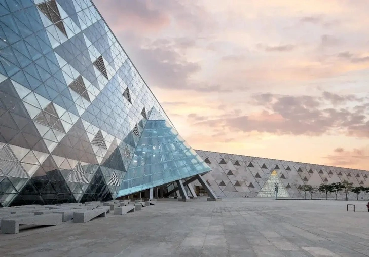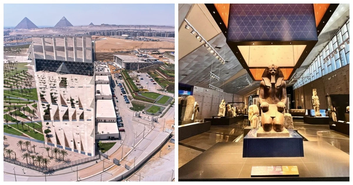 At the entrance, visitors are greeted by an 11-meter-tall, 83-ton statue of Ramses II, which has become the museum's symbol. A grand staircase with majestic statues of ancient Egyptian pharaohs leads to panoramic windows overlooking the pyramids—specially designed to remind visitors that they are all part of a single civilization.