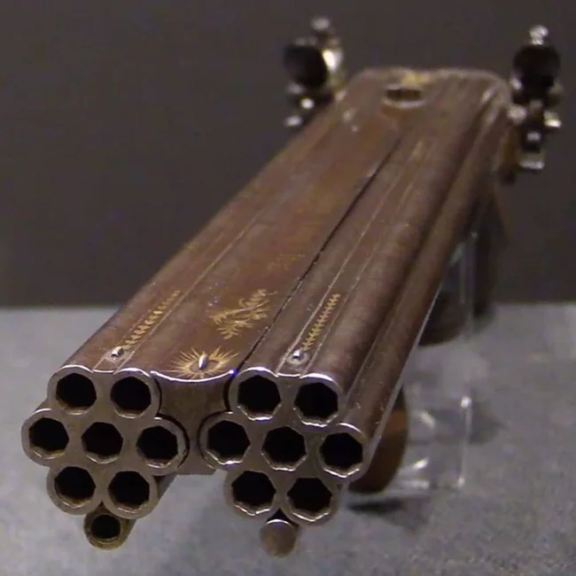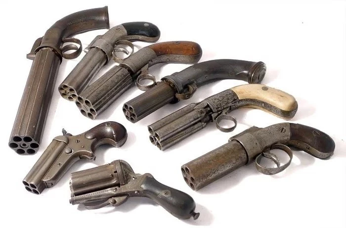 The pepperbox is a multi-barrel pistol with a rotating barrel block. While it lacks a cylinder as such, the revolver half is hinged. The invention of the cap lock was a major impetus for their development, as its presence gave proto-revolvers an advantage in continuous fire. However, this type of firearm was never truly perfected, due to the emergence of the classic revolver in the first half of the 19th century, which featured a modernization device that automatically rotated the cylinder after each shot. As a result, pepperbox pistols became collector favorites, but proved unsuccessful when used for their intended purpose.