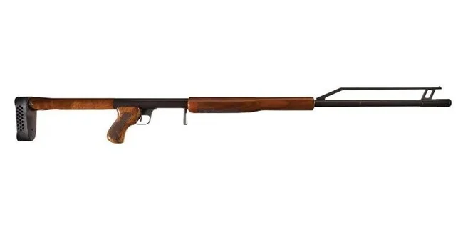 This weapon looks like the child of a rifle and a goldfish. Designed in the late 1950s by Police Sergeant Alfred Crouch, this gas-operated semi-automatic shotgun used a bullpup configuration decades before it became fashionable.