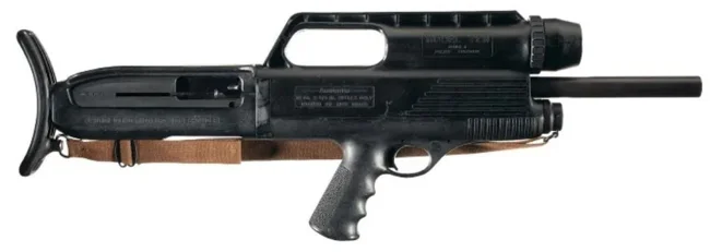 Available in two models—the 10A with a built-in flashlight and the 10B with a mount for a detachable flashlight—the square-rectangular design was intended for tactical police units. The shotgun featured a rotating stock and was only capable of being fired from the right shoulder due to aggressive ejection to the right—the weapon itself literally contained a warning against firing it any other way.