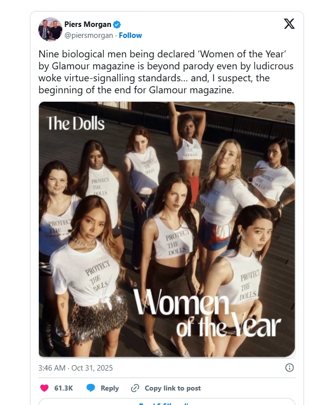 "Nine biological men declaring Glamour magazine's 'Women of the Year' is no longer a parody, even by the ridiculous standards of political correctness... and I suspect this is the beginning of the end for Glamour magazine."