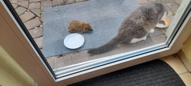 25. My mom has been caring for the neighbor's cat for a long time, and recently started feeding the hedgehog too.