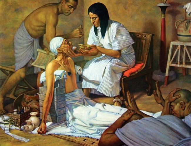 This papyrus likely served as a manual for military surgeons. It describes 48 wounds and injuries, including lacerations, fractures, dislocations, and tumors. Each case is presented in a format remarkably close to modern medical standards. First comes the patient's history and physical examination, which includes checking the pulse, examining the wounds for inflammation, and assessing the general appearance, such as eye and facial color, the nature of nasal discharge, and the stiffness of the limbs and abdomen.