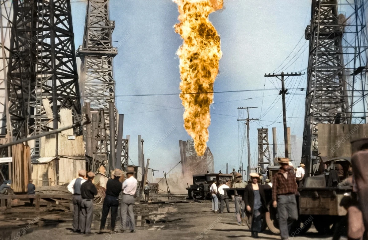 A furious flame erupted from the Bell View No. 1 oil well in one of California's richest fields, causing colossal damage to Santa Fe Springs. Following the explosion, the incredibly intense flames spread to neighboring drilling rigs due to the extreme heat, further exacerbating the devastation. Damages already run into the hundreds of thousands of dollars. This was the second major fire at this oil field.