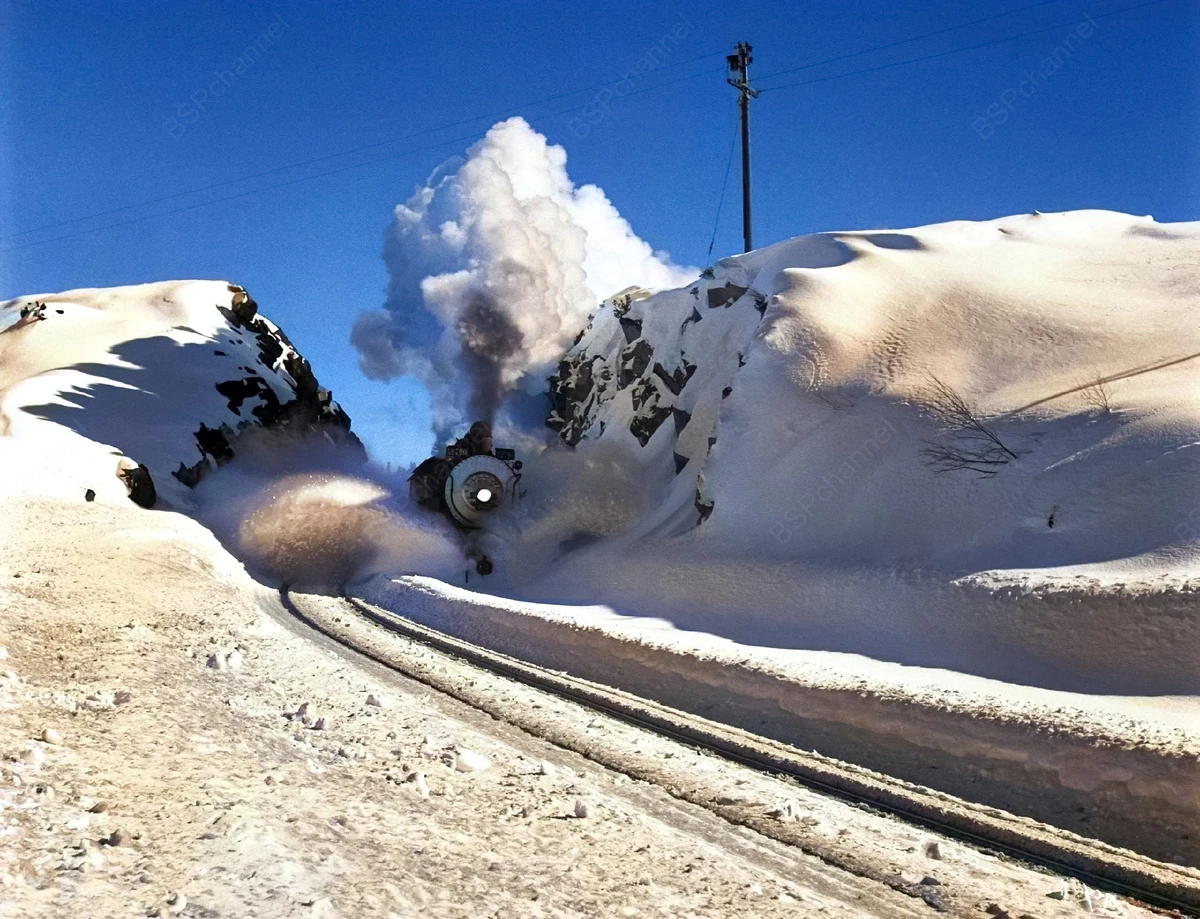 A Southern Pacific locomotive uses a plow to clear snow from the tracks at Donner Pass, five miles west of Soda Springs, California, in 1949.