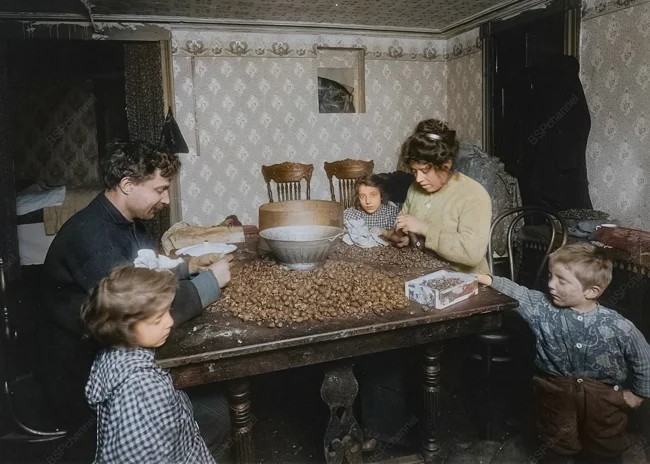 A family sorting through nuts in a dingy basement. New York City, 1911.