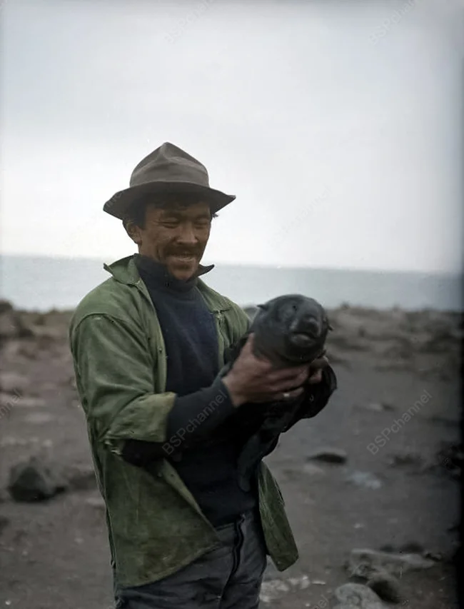 Climbers participated in the annual American Legion ascent. An Aleut with a seal puppy. USA, Alaska, 1910.