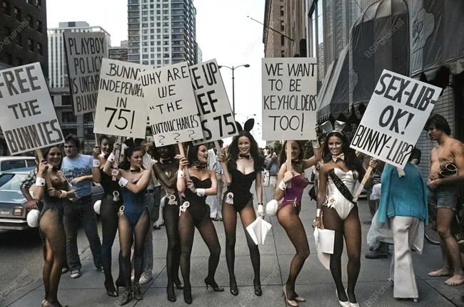 This photo depicts the Playboy Club bunny strike in Chicago on June 18, 1975, when Playboy bunnies protested unfair treatment at work. They demanded higher wages, fairer rules, and greater respect at work. Why it was important: The protest occurred at a time when women were fighting for fairness and equality in the workplace, and it showed how this struggle extended to a workplace that was focused on women's appearance.
