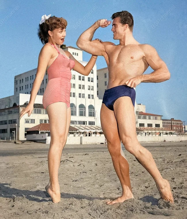 Ed Fury, bodybuilder and Mr. Los Angeles contestant, with model Jackie Coy. USA, 1953.