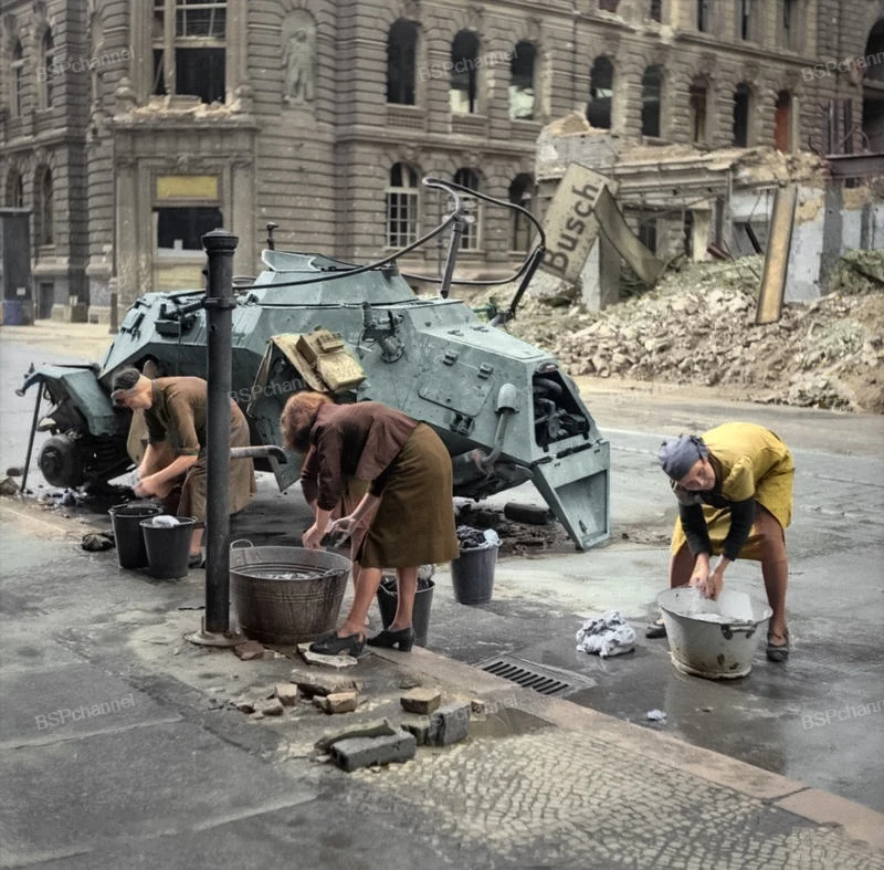 German women wash laundry in cold water on the street next to a disabled German reconnaissance vehicle. July 3, 1945.