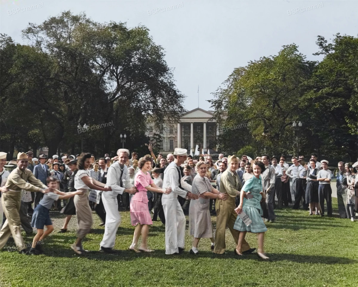 Americans dance on the White House lawn on the day the war with Japan ended, 1945.