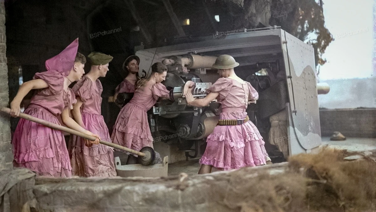 They were sent to the guns (the fort housed 6-inch naval guns) while a pantomime was being performed, in which the soldiers dressed as women. During World War II, British soldiers often staged amateur theatrical productions to boost morale. Particularly popular were buffooneries and musicals in which men played female roles—complete with wigs, makeshift costumes, and makeup. I've already published similar photos of British soldiers in a column dedicated to the First World War. Apparently, the British have a special tradition, and even a unique affinity, for theatrical transformations: dressing as women.