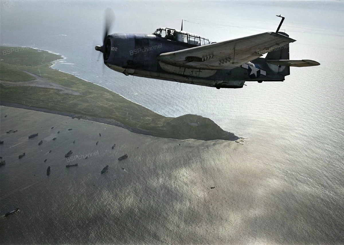 A bomber flies near Mount Suribachi on Iwo Jima. Japan, March 1945.