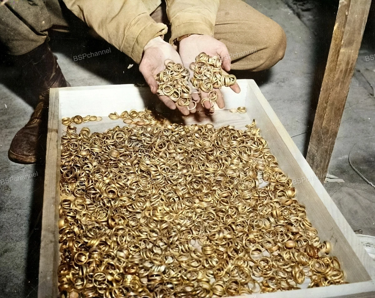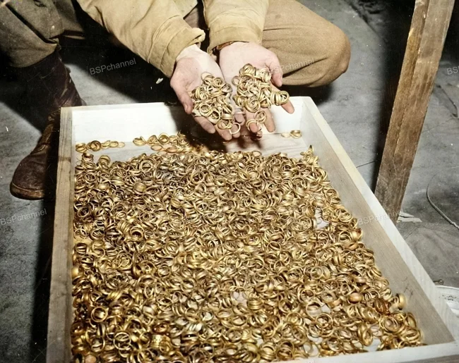 A box containing the wedding rings of thousands of prisoners, discovered by US soldiers among a Nazi treasure cache, Heilbronn Salt Mine, Germany; 1945.