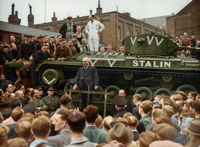 Soviet Ambassador to the United Kingdom Ivan Mikhailovich Maisky speaks at a ceremony at the Birmingham Railway Carriage and Wagon Company plant in Birmingham, marking the transfer of the first tanks to the Soviet Union under the Lend-Lease program. September 1941.