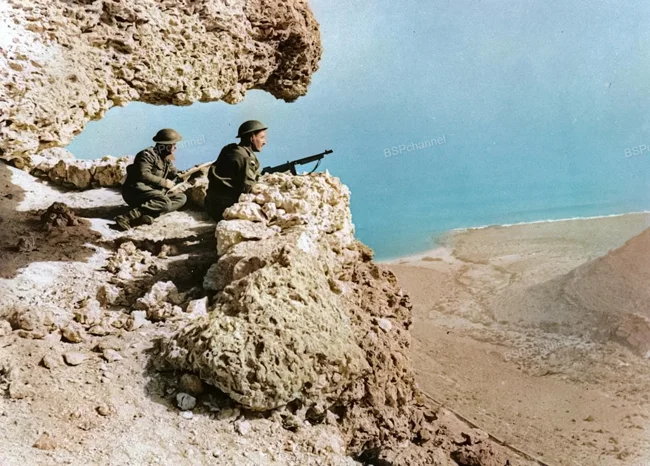 A British patrol observes enemy movements in the Western Desert Valley on the Egyptian side of the Egypt-Libya border in February 1942.