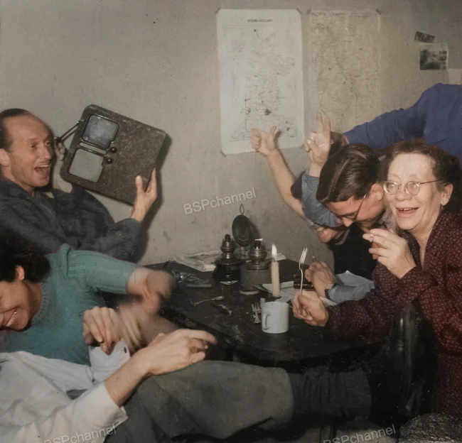 Dutch Resistance members hear the news of Hitler's death on the radio, 1945.