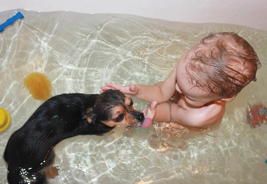 The first time they decided to bathe the baby, the dog jumped into the tub all by itself. I saw the photos they took: in them, the dog, looking completely miserable and determined, stands over the baby lying on the bath cushion, his paws submerged in a few centimeters of water. His whole posture screamed, "I won't let you subject this poor child to such horror!"