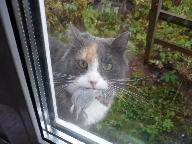 A few minutes later, after walking around the house, he found the cat in the yard. She was sitting with a mouse pinned to the ground with her paw.