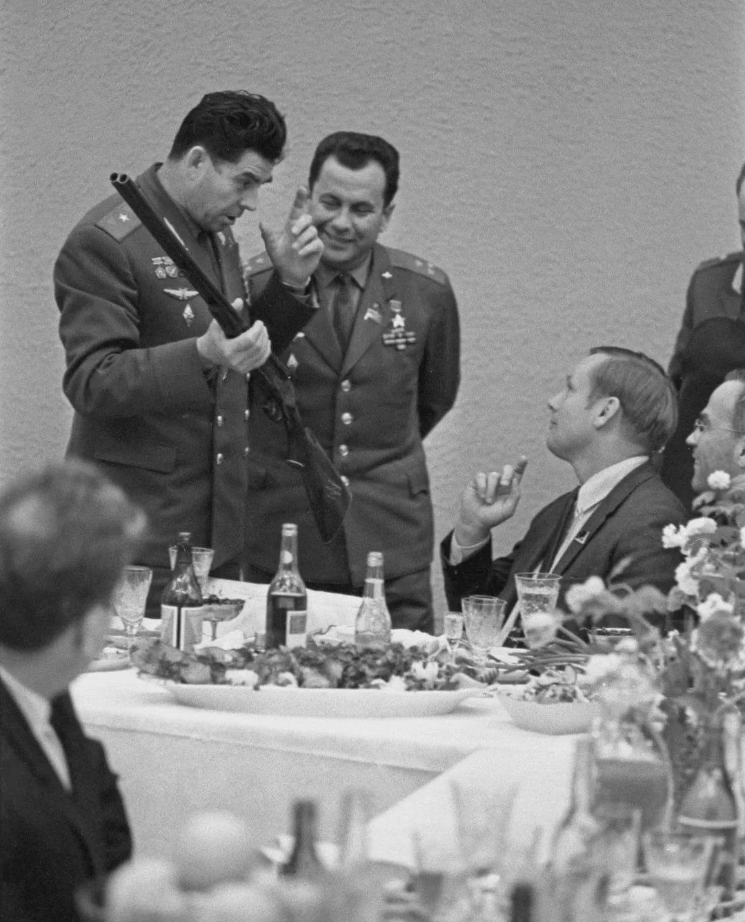 5. Soviet cosmonauts Georgy Beregovoy and Pavel Popovich present Neil Armstrong with a hunting rifle, June 1, 1970