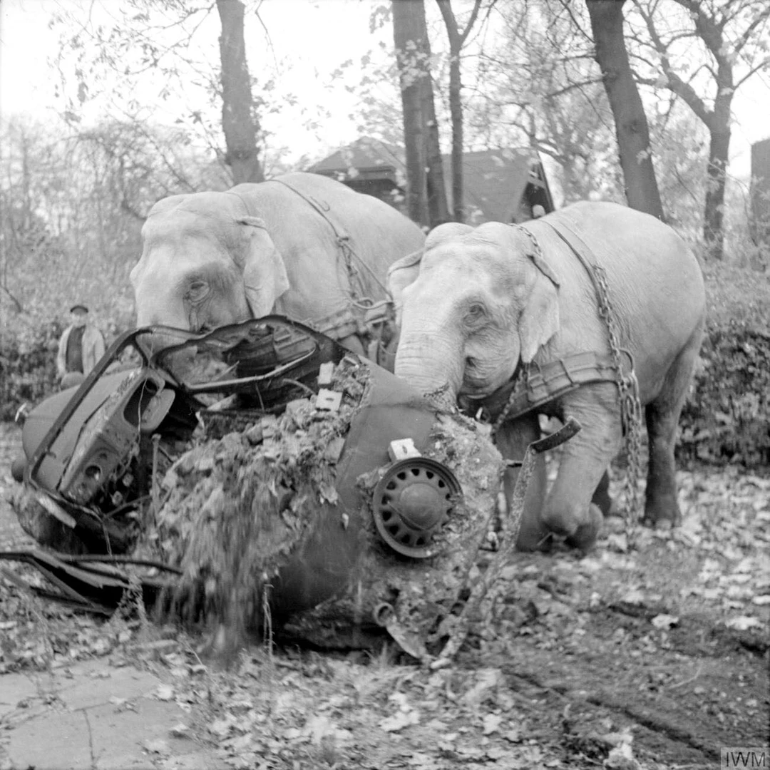 6. Two circus elephants, Kiri and Manny, move a wrecked car during post-war cleanup work in Hamburg, November 5, 1945
