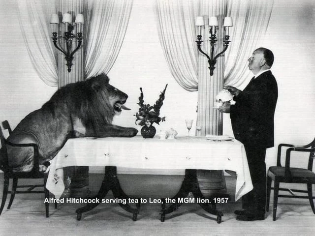 10. Alfred Hitchcock and the MGM Lion drinking tea, 1957 year