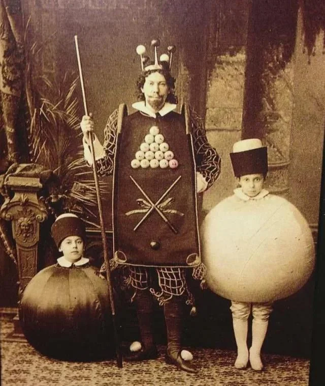 9. A man dressed as a billiard king, with two sons dressed as billiard balls, 1886