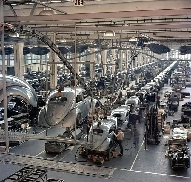 14. Production of Beetle cars ("Oval") with oval windows at the Volkswagen plant in Wolfsburg, circa 1954 Year