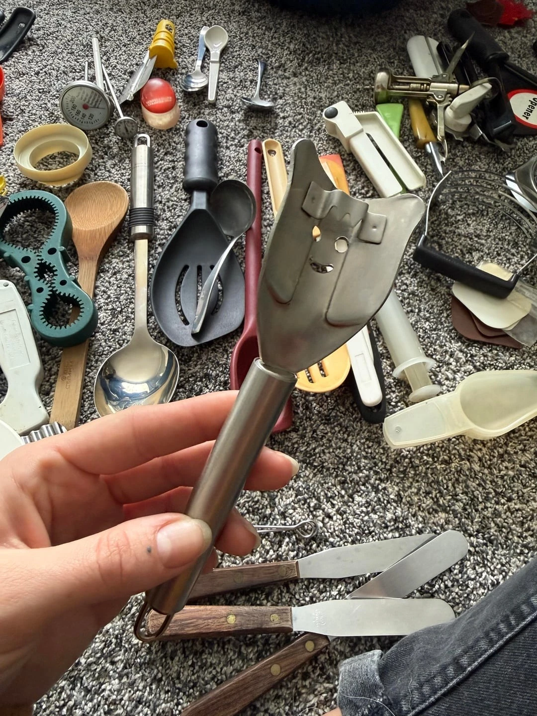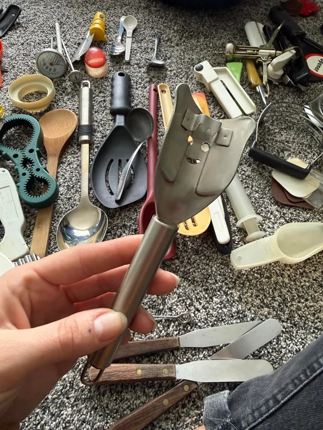 6. A kitchen tool with a loop and a perforated spatula, found in a drawer with dishes in my grandparents' house.