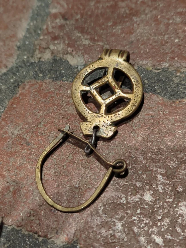4. A small metal object with a hook, consisting of two parts connected by wire.