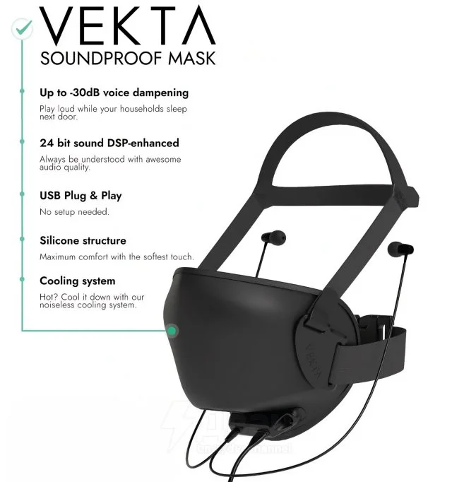The VEKTA soundproof muzzle for gamers is a mask that muffles any screams during epic virtual battles. Now you can yell at your teammates whatever you want, as long as you want, and your family and neighbors won't hear a word. It features a 24-bit microphone, a cooling system, and soft silicone pads. It costs $200. It seems like a strange thing, but... there's something about it.