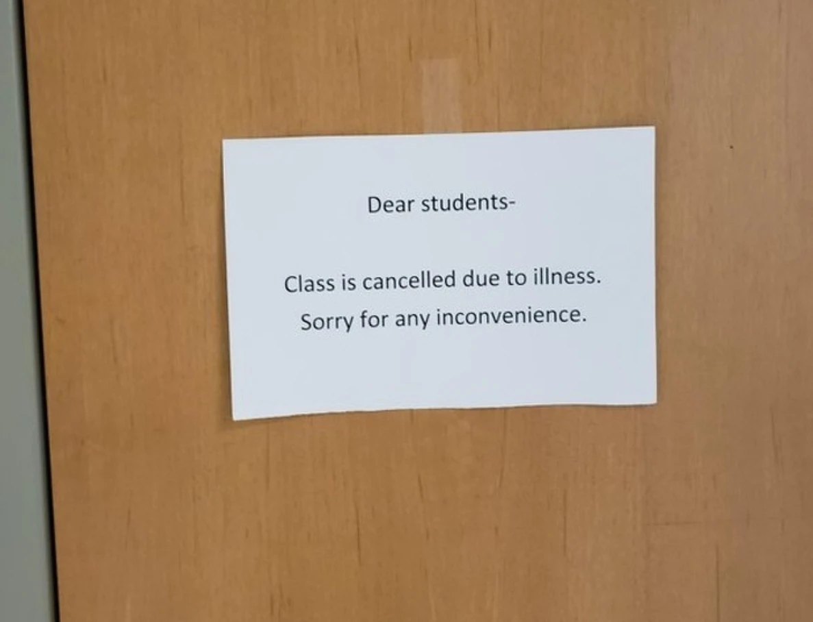 It's frustrating when you're driving to class early in the morning, it's pouring rain outside, and everything is frozen. And when you arrive, you see a note from the teacher on the classroom door. Not the best morning, though.
