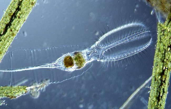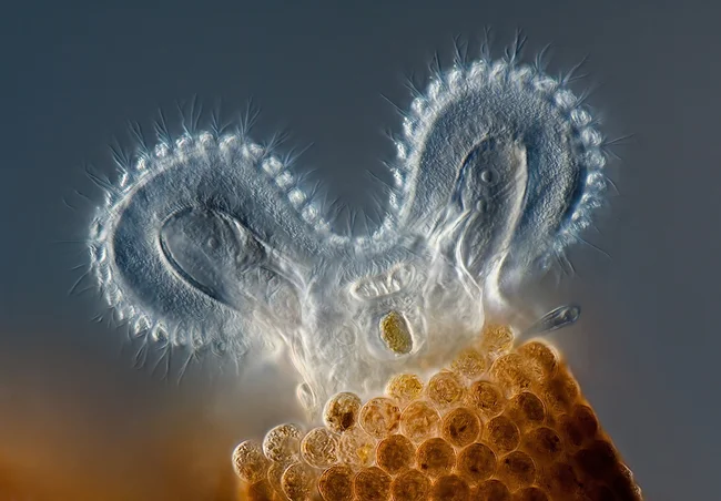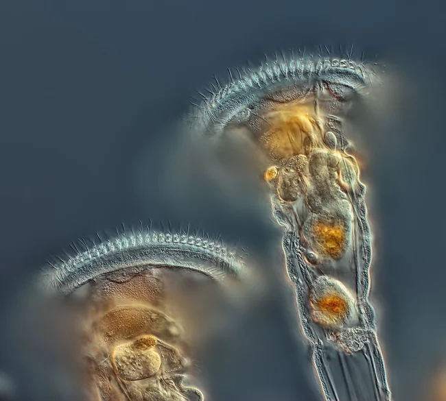 Rotifers are tiny protostomes. They're not bacteria, slugs, or worms, but a distinct type of multicellular organism, unlike anything else. Rotifers are found everywhere: in seawater, freshwater bodies, soil, even the next puddle! There are currently over 1,500 known species. Why haven't you ever seen them? Because it's impossible to see these microscopic creatures without a microscope.