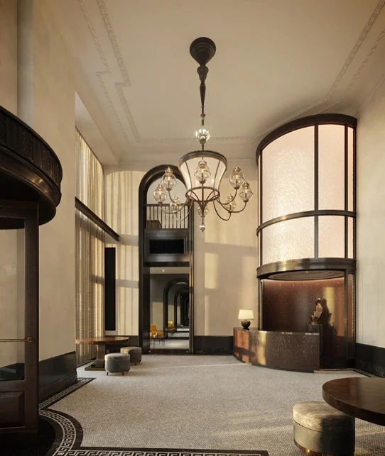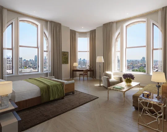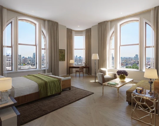 The iconic Flatiron building in New York City has been converted from office space to residential use, now housing 38 residences. Studio Sofield was responsible for the interior design. During the renovation, the building, which previously served as offices, was converted into residential housing while preserving many historic features, including the railings. According to The New York Times, prices for apartments range from $11 million to $50 million.