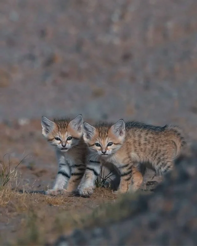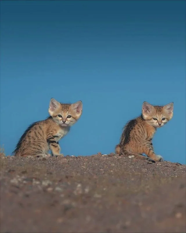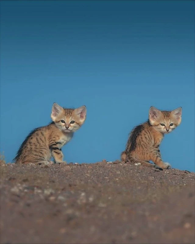 Wild sand cats were photographed in the desert—they live only in arid climates and resemble fennec foxes. These kitties are smaller than domestic cats and have very large ears.