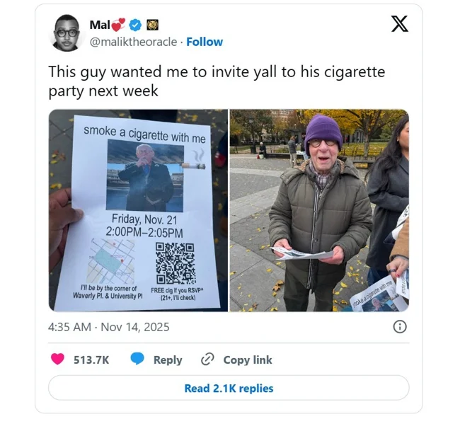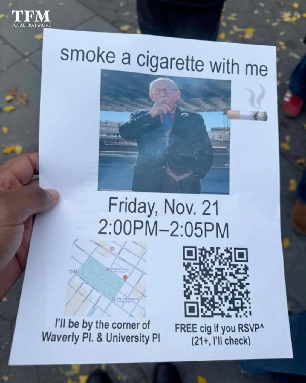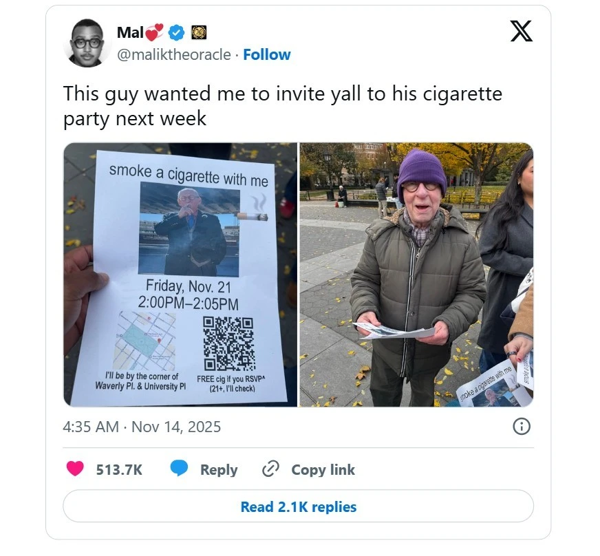 The offer was simple: 2:00 PM - 2:05 PM. Just five minutes, one cigarette, and if you confirm your participation via QR code, a free cigarette from Bob himself. The QR code led to Partiful, where he wrote: "I'll give you one free if you confirm your participation."