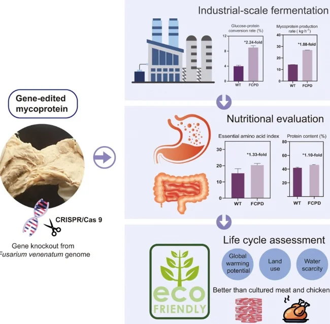 Using CRISPR technology, scientists carefully "disabled" two fungal genes. The first is responsible for excessive chitin synthesis, which significantly thins the cell walls and allows for almost complete protein absorption. The second gene controls growth rate and nutrient consumption: after its deactivation, the fungus grew 88% faster, and its sugar consumption decreased by 44%.
