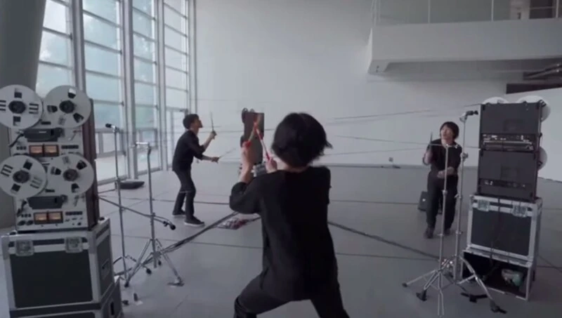 Musicians from the Japanese group Open Reel Ensemble stretched magnetic tape from reel-to-reel tape recorders onto a triangular frame and played it with drumsticks.
