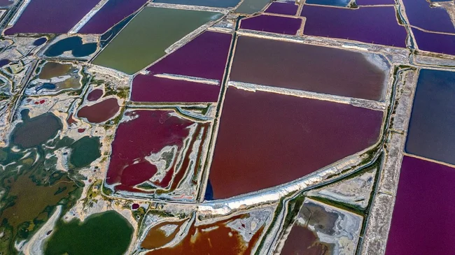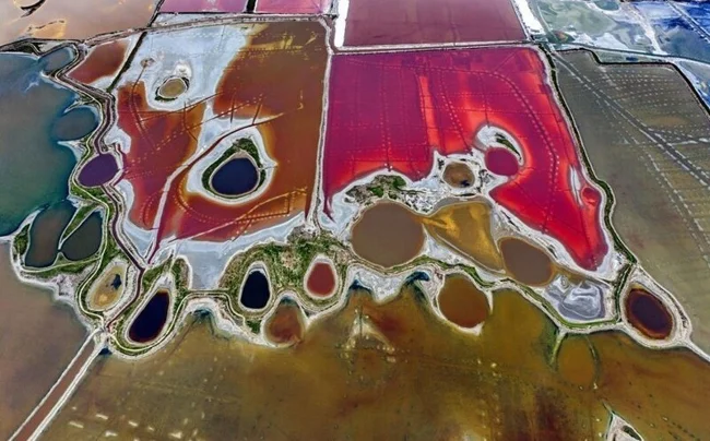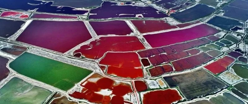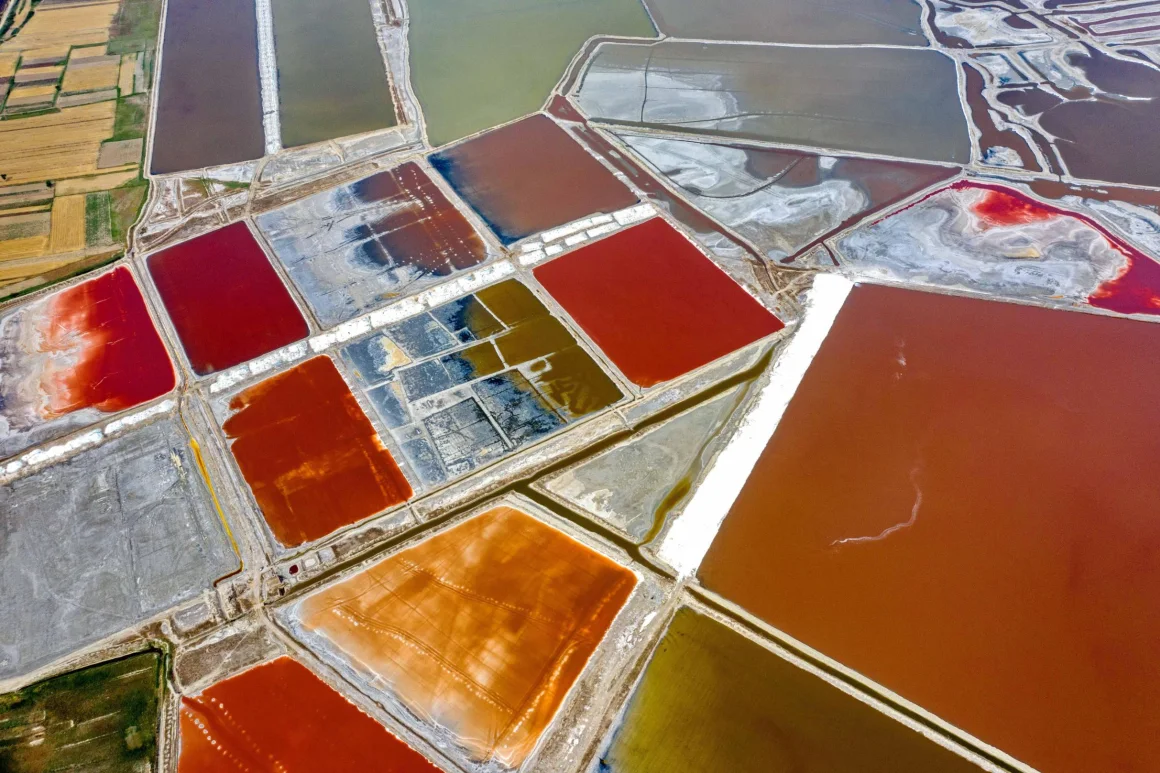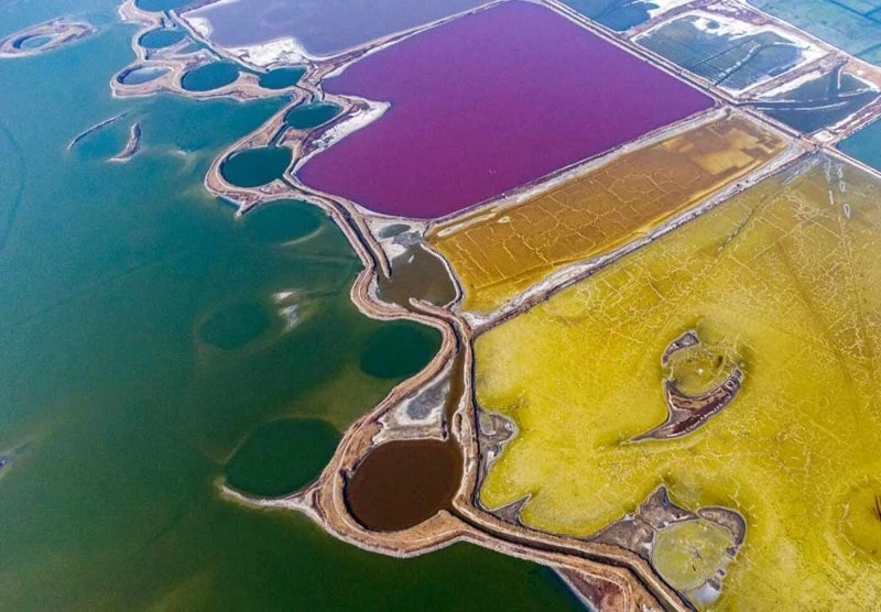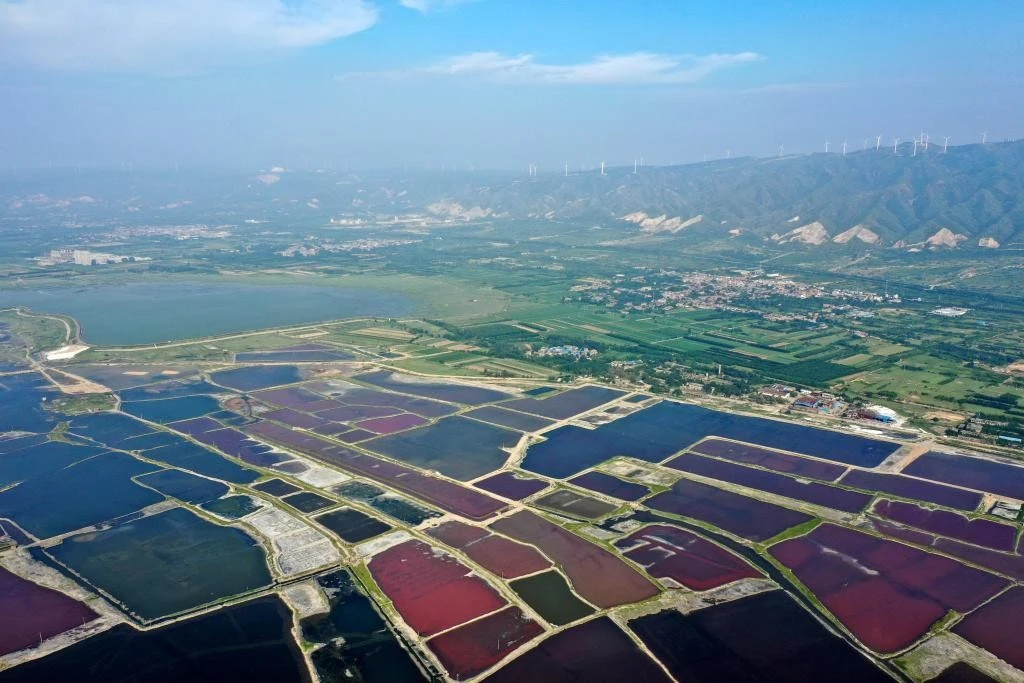With the arrival of summer, the mirror-like surface of Yuncheng Lake in Shanxi Province is transformed, becoming a dazzling rainbow. From above, the lake resembles an artist's palette, adorned with brushstrokes of purple, emerald, and turquoise.