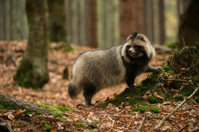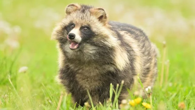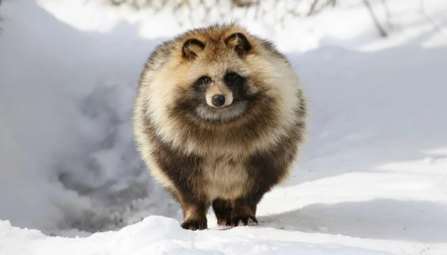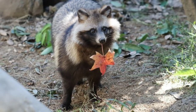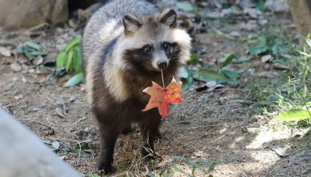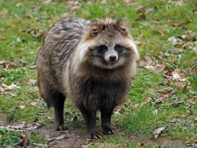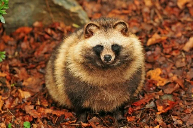 This is a raccoon dog. It lives in Japan and resembles a raccoon in appearance, although genetically it is a member of the canine family. It has short legs, a sturdy body, very thick fur, and a dark "mask" on its face. It can hibernate briefly in winter, which is unusual for canids. Raccoon dogs are omnivores: they eat berries, insects, small animals, and other readily available food. They are primarily active at night and usually live in pairs, forming long-term monogamous bonds. They can also be tamed!