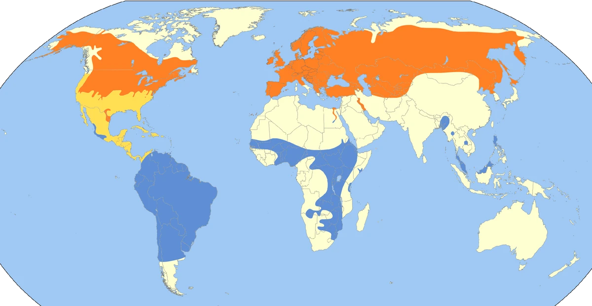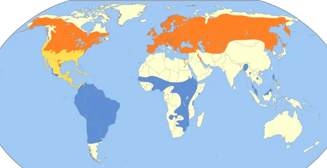 Orange is the breeding area. Yellow is the migratory area. Blue is the non-breeding area (where they migrate for the winter).