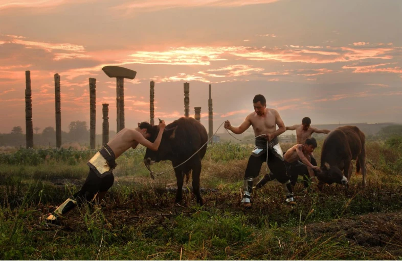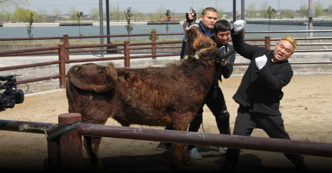 Before fighting a real bull, students at China's last bull-wrestling academy must wrestle a carved wooden head bolted to the courtyard wall. They are shown how to properly grab the bull's neck, balance, and avoid being gored. They must twist the bull's neck more than 90 degrees. And they mustn't go head-on. They must walk around the bull in a circle. Training on a wooden bull can take several months. If you haven't been gored by a wooden cow, you're ready to train on bulls under a trainer's guidance. Just to get used to their speed and stability.