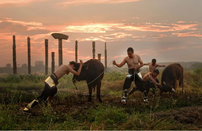 The art of bullfighting is called guannu. It was quietly and peacefully passed down within the tribe and didn't attract many tourists. Until 1982, when the oldest bullfighting master, Han Haihuan, brought it to the attention of the entire country by organizing a match at the Second National Traditional Games for Ethnic Minorities. Everyone loved this "Chinese bullfight" (but without the pikes!) so much that everyone asked – when will there be more performances like this? In 2011, it was added to the national list of intangible cultural heritage. And the bullfighting academy is its last stronghold.